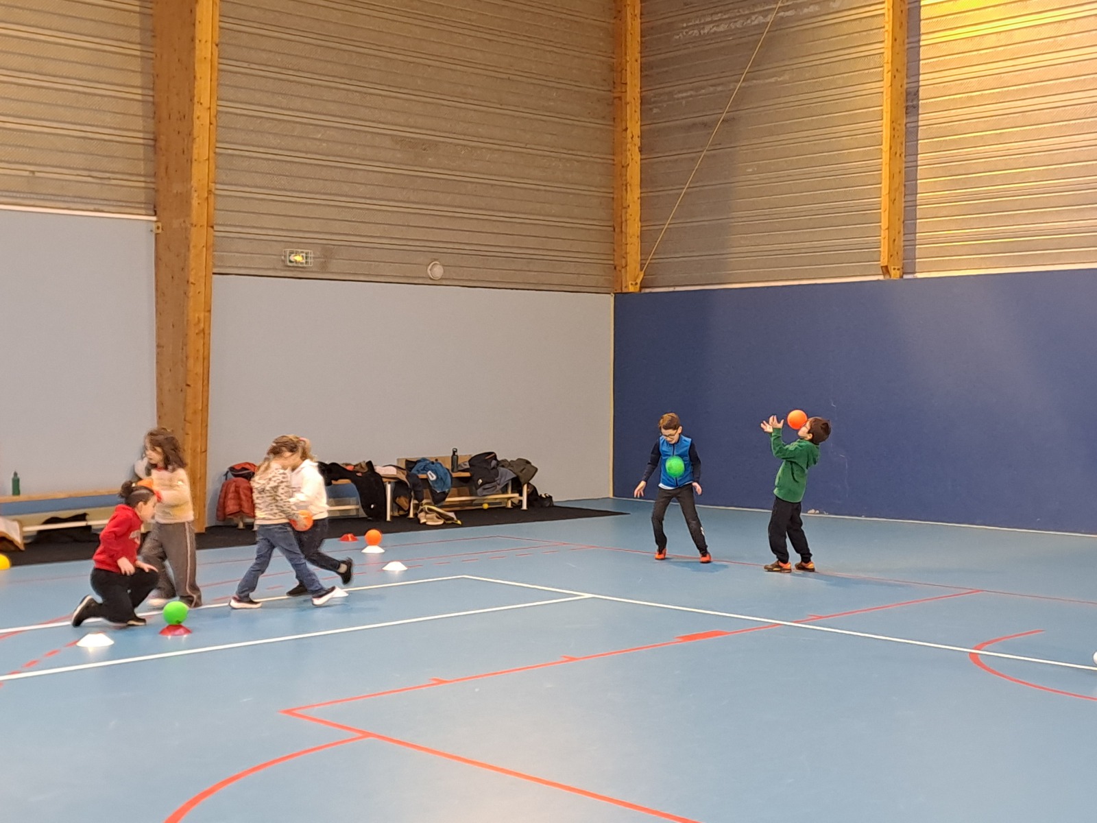 Pendant 3 séances, nous sommes allés  à la salle de sport faire du hand-ball. Gaël animateur du comité vendéen de hand-ball nous a inviter à dribbler, passer, tirer, capter, lancer, se déplacer, arrêter.