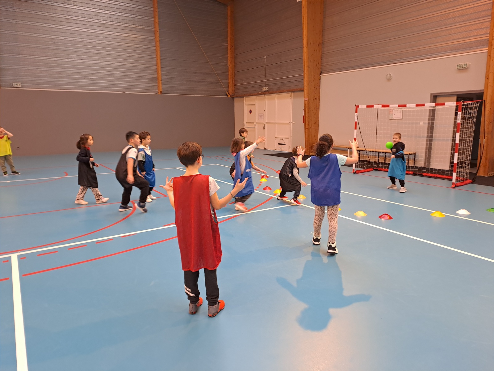 Pendant 3 séances, nous sommes allés  à la salle de sport faire du hand-ball. Gaël, animateur du comité vendéen de hand-ball nous a invité à dribbler, passer, tirer, capter, lancer, se déplacer, arrêter.